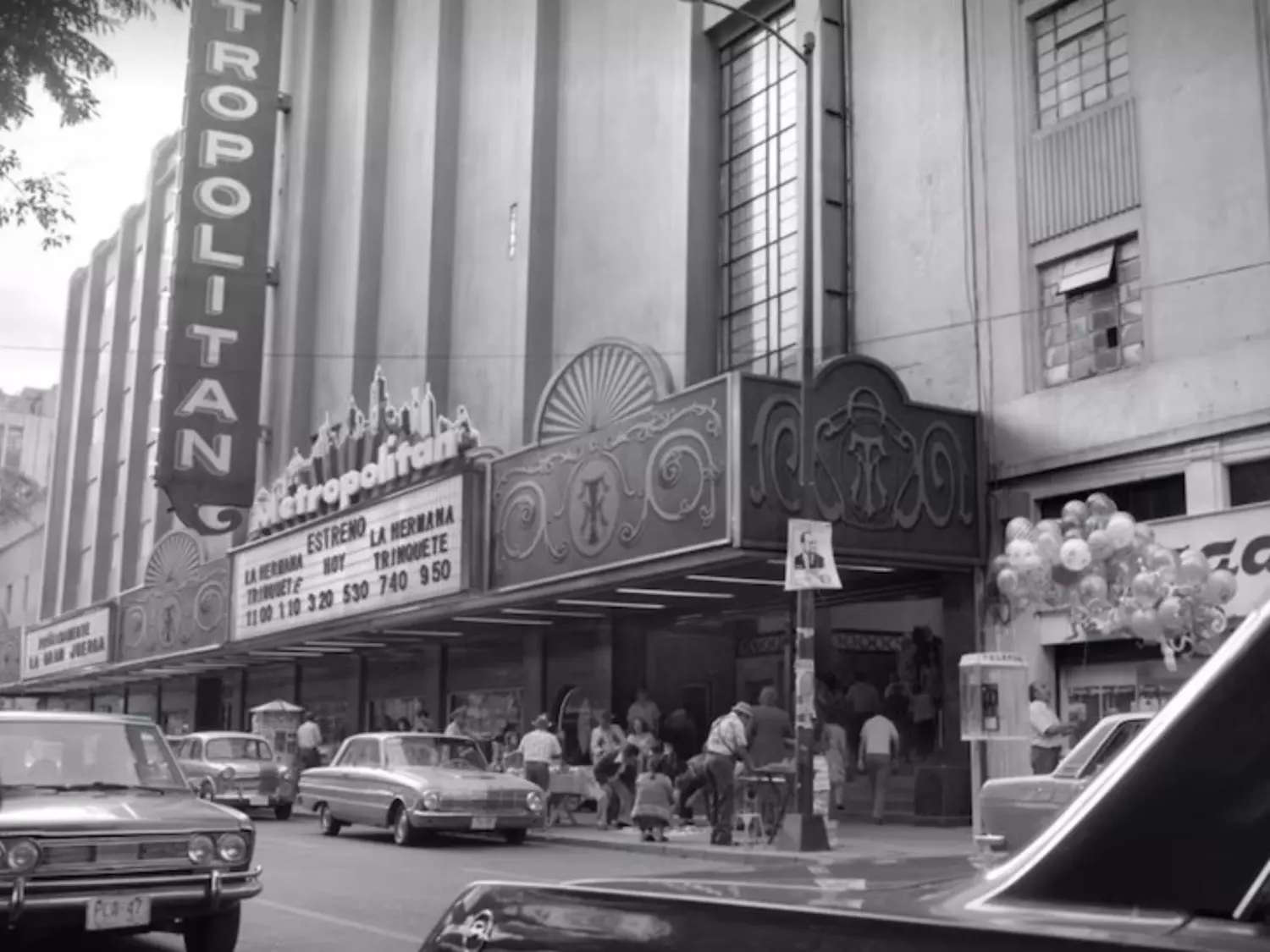 The Metropolitan Theater appears to underscore the Mexico City of entertainment and public life that surrounds the intimate world of the house. Its Art Deco façade lends scale and a sense of era, as if history were momentarily stepping outside the neighborhood and encountering a larger city. In black and white, its lines and shadows feel almost like a collective memory.