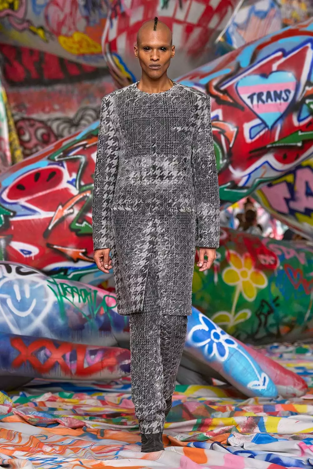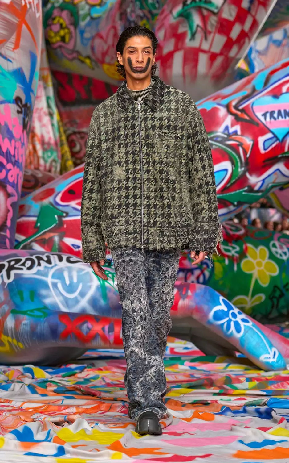 A boxy, zip-front houndstooth jacket is paired with intricately distressed denim for a textural clash. Set against the graffiti-drenched runway, the look embodies Diesel’s FW25 ethos of deconstruct and disrupt.