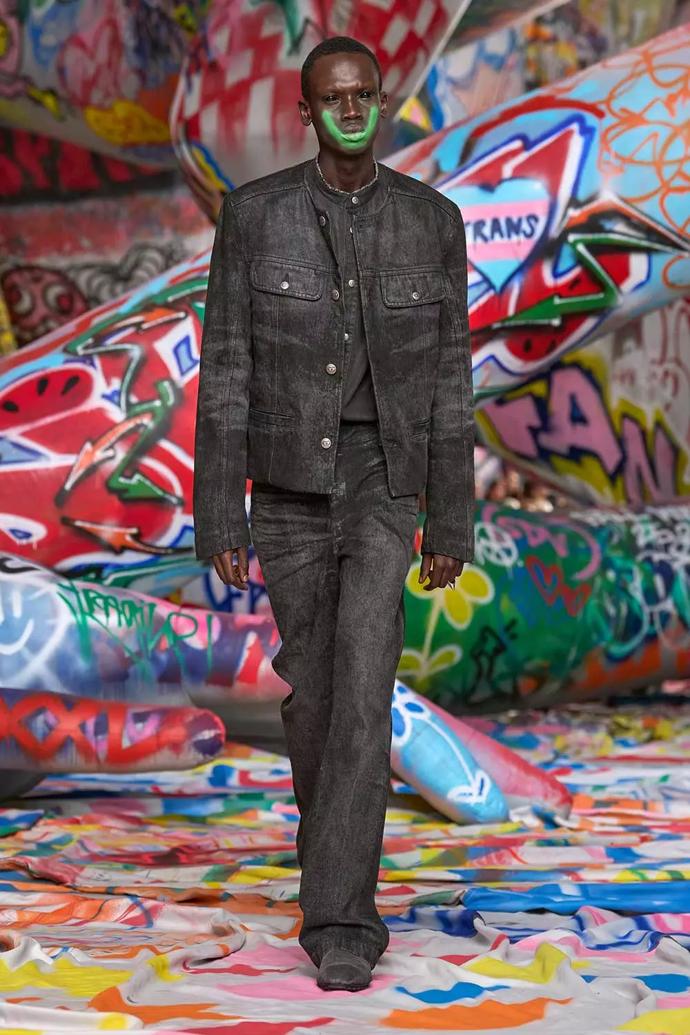 Presented inside a colossal graffiti-covered installation, Diesel’s FW25 runway merges deconstruction, rebellion, and craftsmanship. Denim is lacquered, shredded, and distorted, while street art becomes both set and statement.