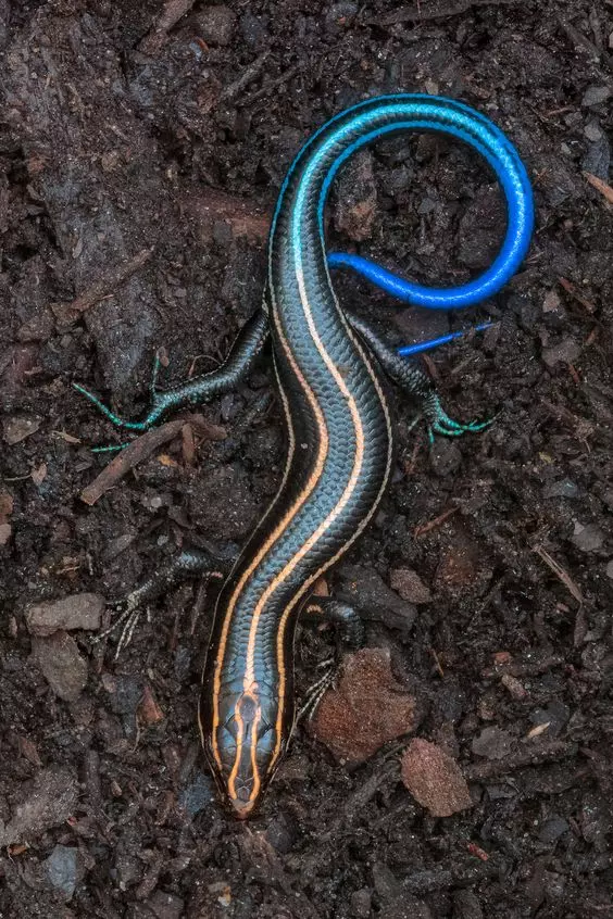 Known for the bright blue tail they sport when young, the five-lined skink is the most common lizard in North America. Their white or yellow stripes and their blue tail fade as the skinks mature, growing to 8 inches long. These critters live in woodland areas, often found beneath logs or under tree bark.