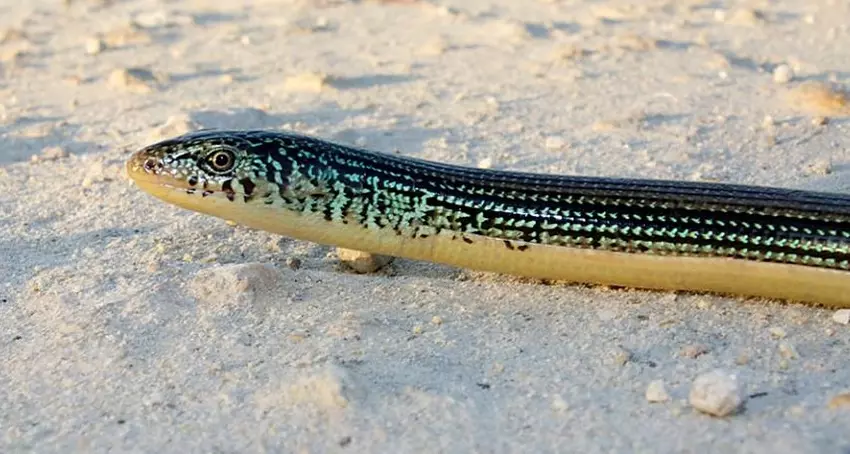 This oddball lizard has no legs and is commonly mistaken for a snake. It can grow to as long as 43 inches, and, like many lizards, will detach its tail if it’s stepped on or grabbed by a predator. This lizard has a brown body that is splotched with white dots and dashes. It’s commonly found in wet or marshy areas in the Southeast.