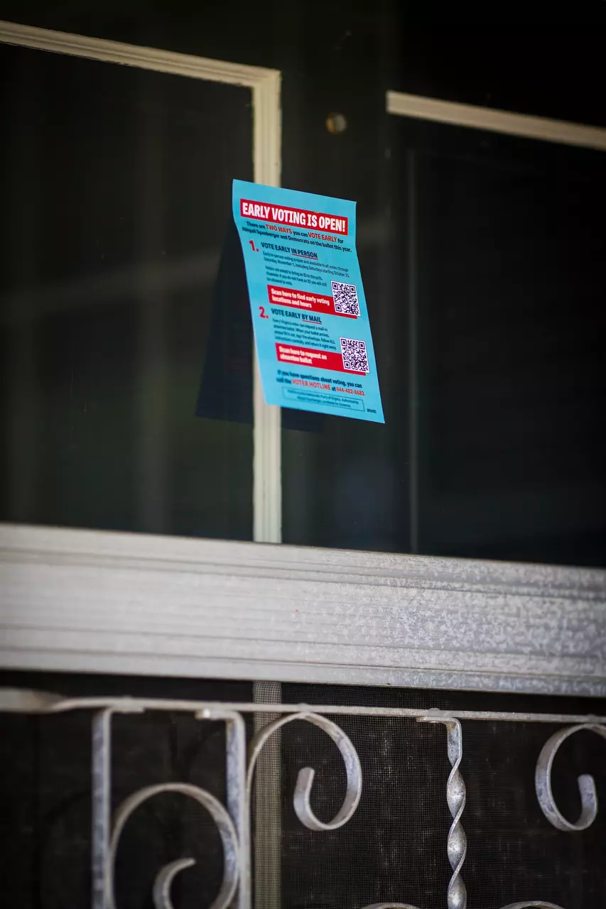 A campaign flyer from the Virginia Democrat Party left by Rae Pickett, who is Communication Director for Planned Parenthood Advocates of Virginia, for candidate Abigail Spanberger in the governor's race, Oct. 19, 2025 in Petersburg, Va. (AP Photo/John Clark)