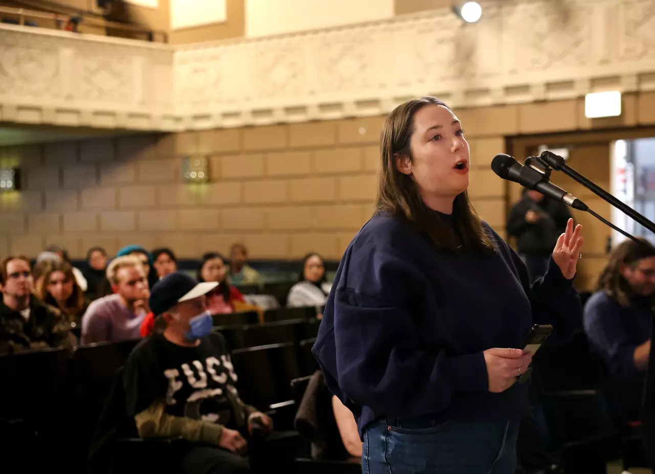 Erin Vogel, of the Community Commission for Public Safety and Accountability's 9th District Council, speaks during the public comment portion of a CCPSA monthly meeting at Hubbard High School on Chicago's Southwest side on Feb. 26, 2026.